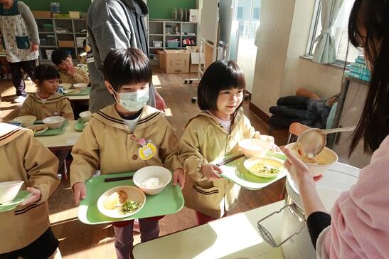 お味噌汁の具にも、かがやきファーム(園畑)で取れたダイコンとほうれん草が入っています。