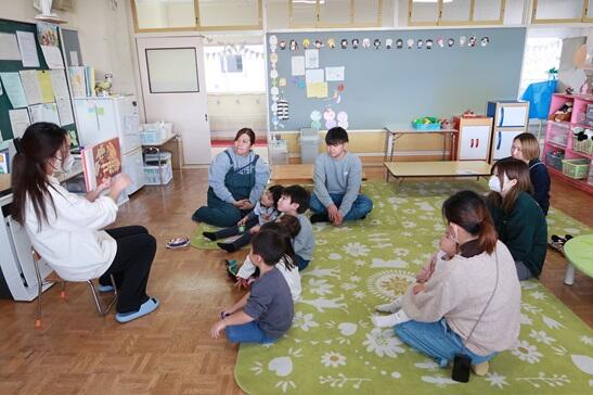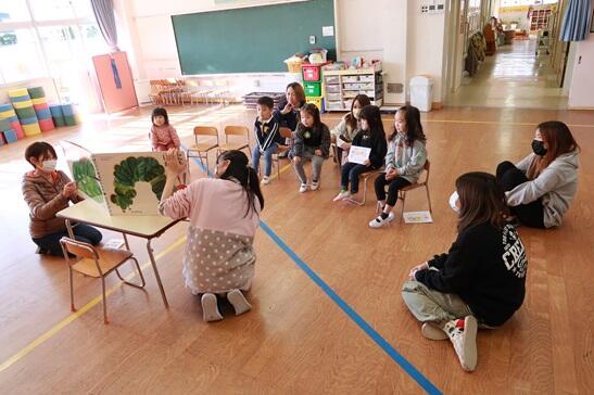 読み聞かせは、「腹ぺこあおむし」です。大型絵本なのでIさんのお母さんに手伝ってもらいました。