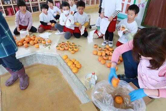 子どもたちは慣れたもので、すぐに柿を磨いてへたをとって、樽抜き柿づくりです。