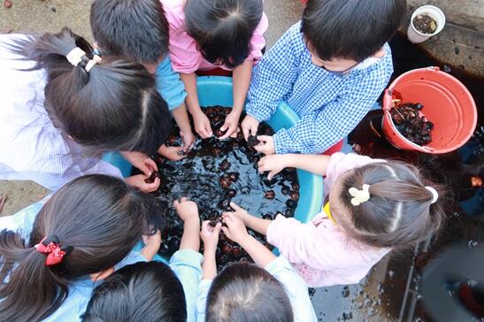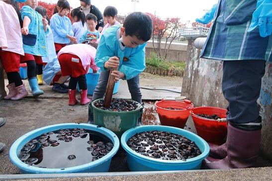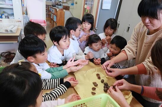 11月24日(金)園長先生からクルミをたくさんいただきました。クルミの殻の外側に皮取りから始めます。年長さんは昨年もやったので上手です。