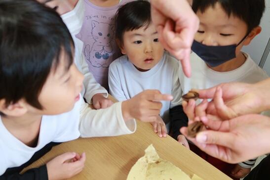 「わあ!おいしいなー!」みんなでクルミの味見をしてみました。
