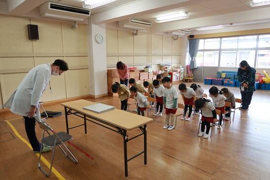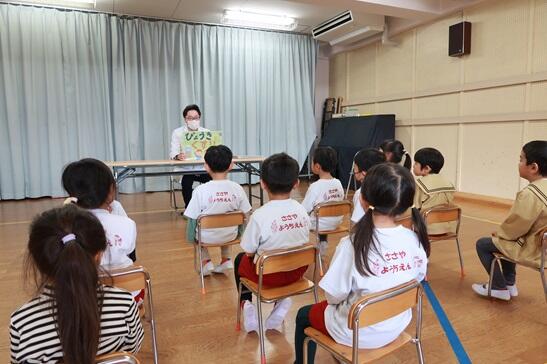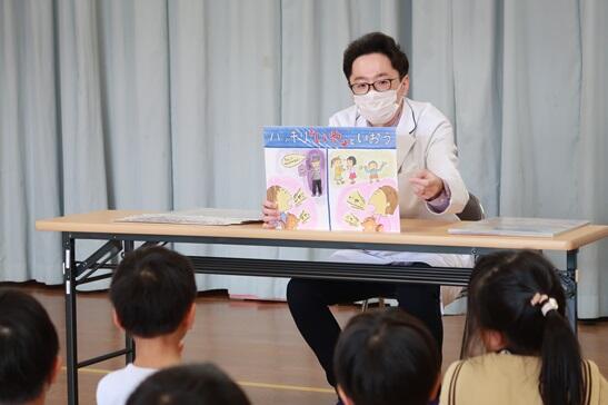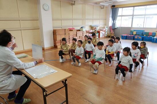 矢吹先生には、幼稚園児に分かりやすいように「びょうきとくすり」の視点から紙芝居でお話しいただきました。