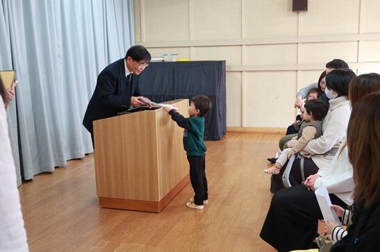 新しいお友達一人一人に、園長先生から入園許可証が手渡されました。みんな上手にもらえました。