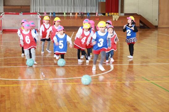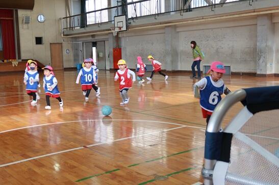 サッカーボールとお友達になれたら、次はミニゲームです。2チームに分かれて、5個のボールを使って行いました。