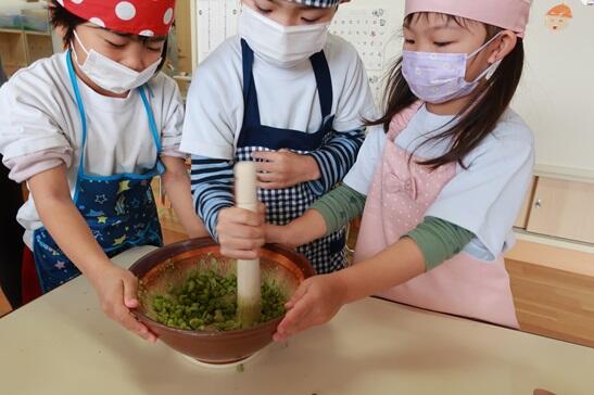 最初に枝豆とくるみを細かく砕いて、すり鉢で摺って、砂糖と塩を少し入れて餅餡を作りました。