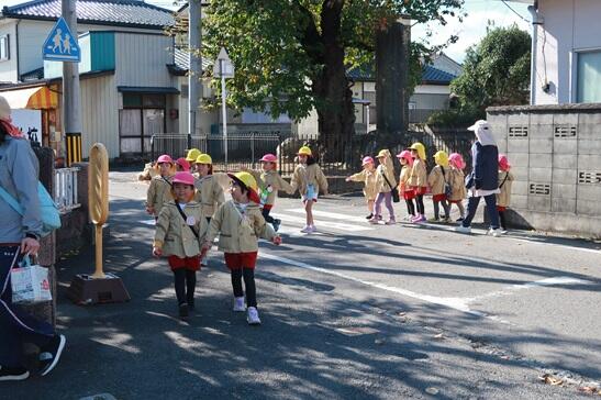 今日の園外保育(散歩)の目的をみんなで確認しています。