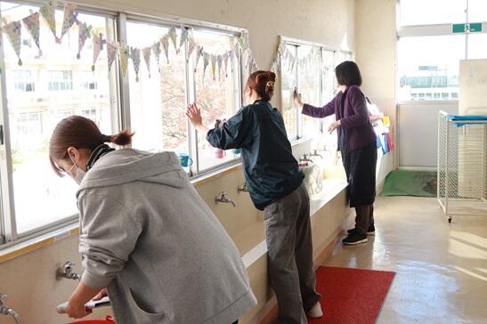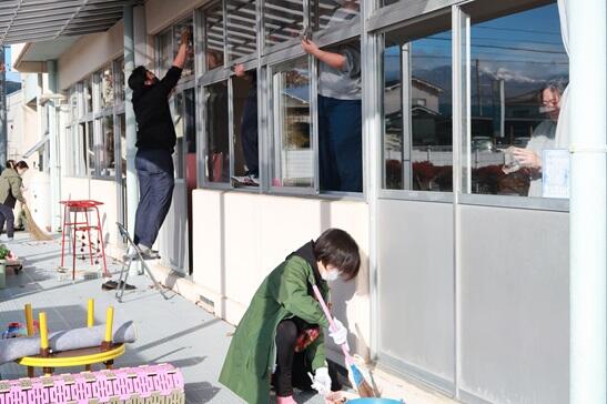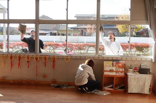 園舎のガラスはピッカピカ、玄関も園庭もきれいになりました。保護者の皆様ご協力ありがとうございました。