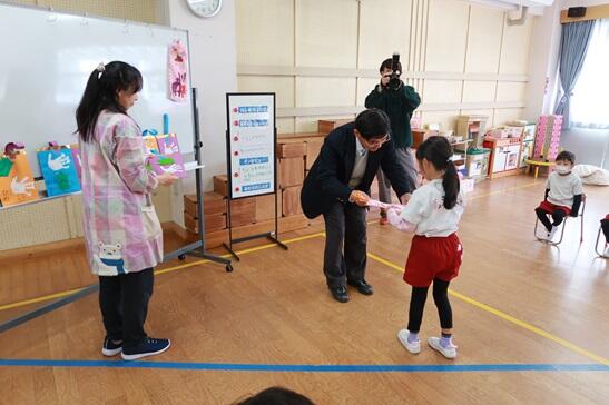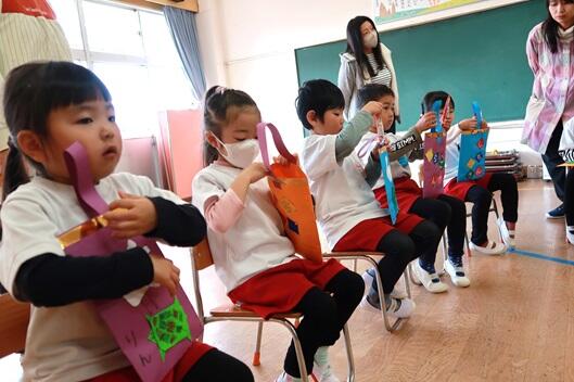交流活動の最後に、笹谷小学校の1年生から年長児は手作りのプレゼントをいただきました。