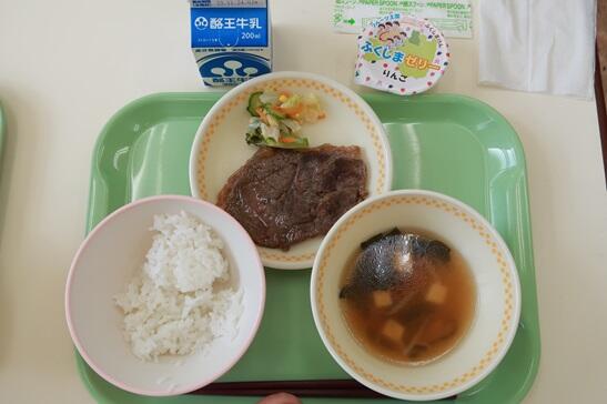 メニューは、県産牛ステーキおろしソース、県産ブロッコリーサラダ、伊達鶏の五目スープ、ふくしまゼリー(りんご)にご飯と牛乳です。超豪華メニューです。