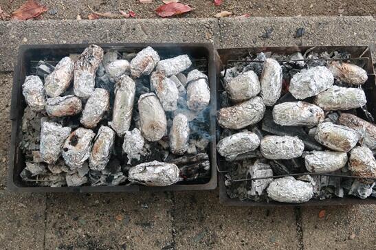 子どもたちが新聞紙に包んで水に浸しアルミホイルで包んだサツマイモを、炭火の上にのせていきます。