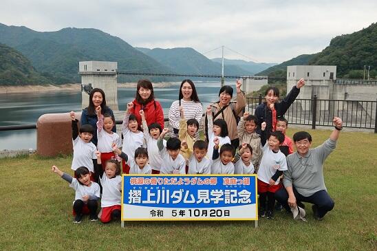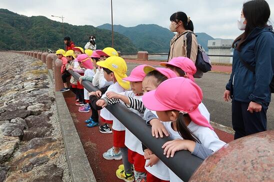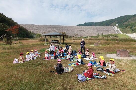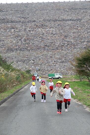 年長たけのこ組さんは、ダムの500段以上もある階段を下りて、ダム下の広瀬公園に来ました。