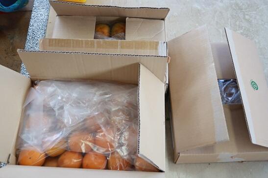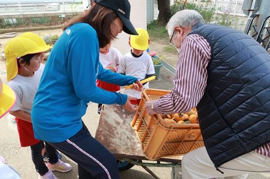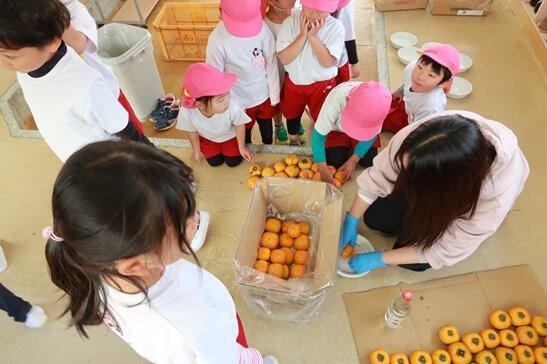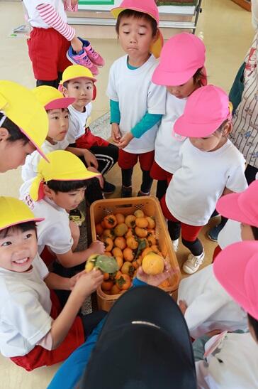 かがやきファーム(園庭)をお借りしている齋藤さんから、コンテナいっぱいの柿をいただきました。