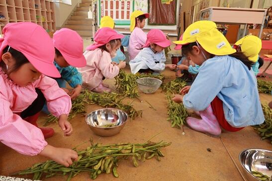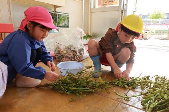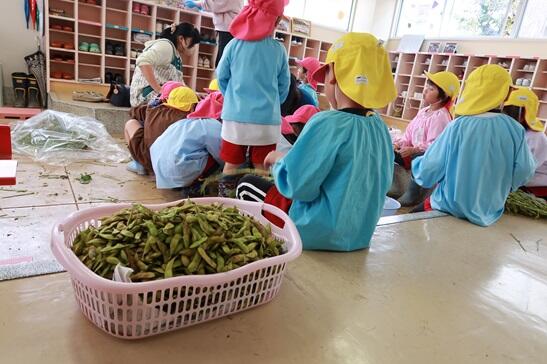 枝豆は茹でて、お昼にお弁当と一緒にいただきました。子どもたちのお持ち帰りお土産分もあります。