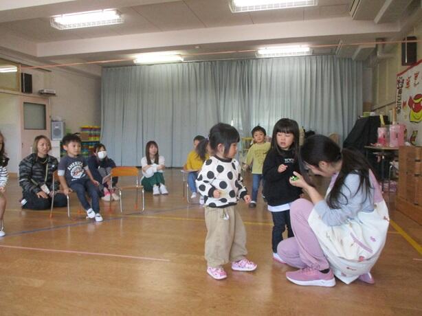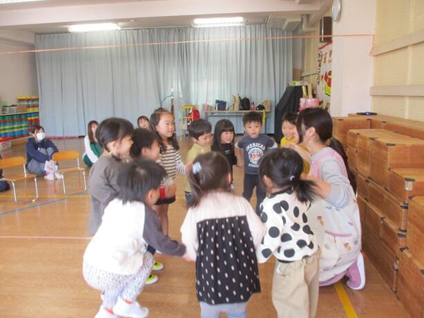 園庭で十分に遊んだ後、遊戯室で手遊びや読み聞かせをしました。