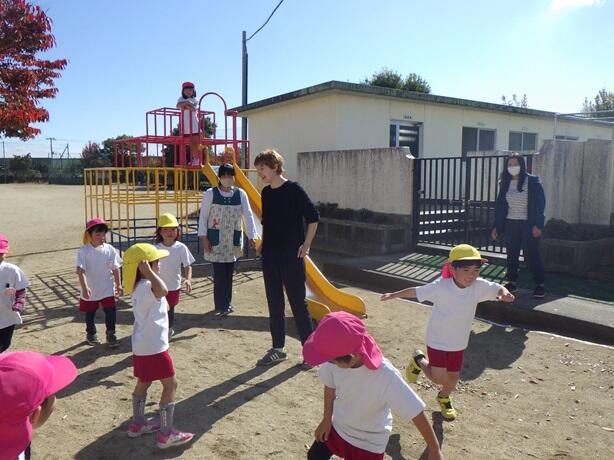 園庭では、アメリカのじゃんけんの仕方を教えてもらったり、子どもたちと「氷鬼」や「だるまさんが転んだ」などをして楽しく遊んでいただきました。