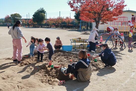 外で過ごすのに丁度よい秋晴れの日です。最初に楽しく砂遊びをして過ごしました。