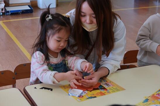 みんな、愛果先生の話をよく聞いて上手に目や口をのり付けしていました。