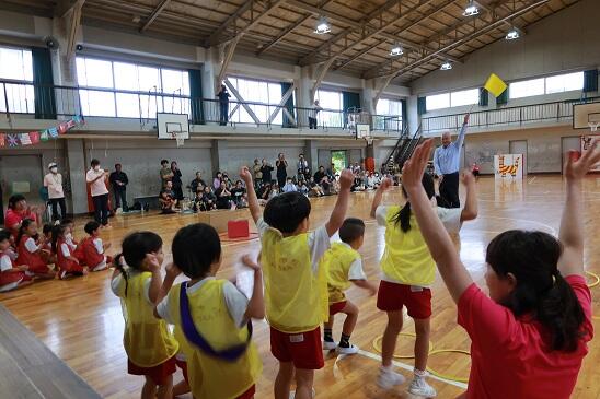 準備運動の「じゃんぐる・ぐーるぐる」です。来賓の方々も、保護者の方々も、先生方もノリノリです。