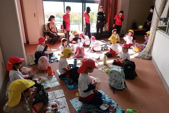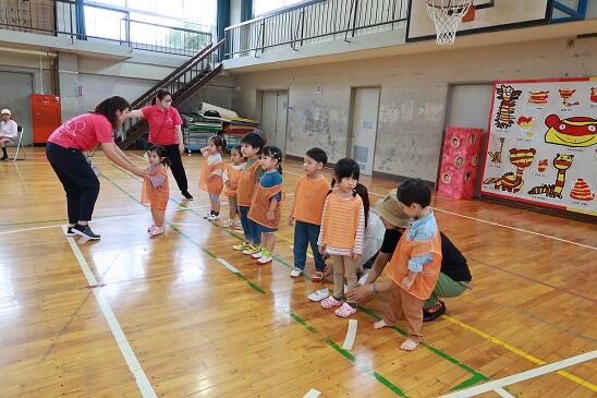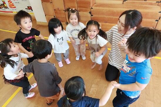 十分にお買い物ごっこで遊んだ後は、遊戯室で愛果先生の手遊びです。みんな上手に出来ていますね。