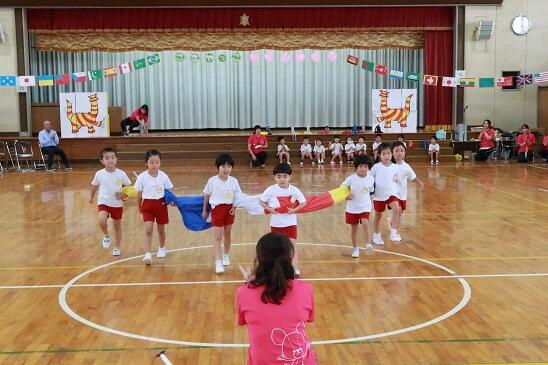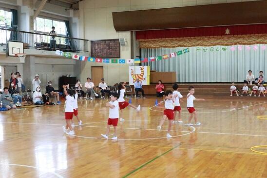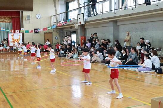 年長たけのこ組のダンス「ぼくらはもう一人じゃない」です。縄跳びやフラフープを使って華麗に踊ったり、体育館いっぱいを使った身体表現など、みんなが一つになった見事な演技です。