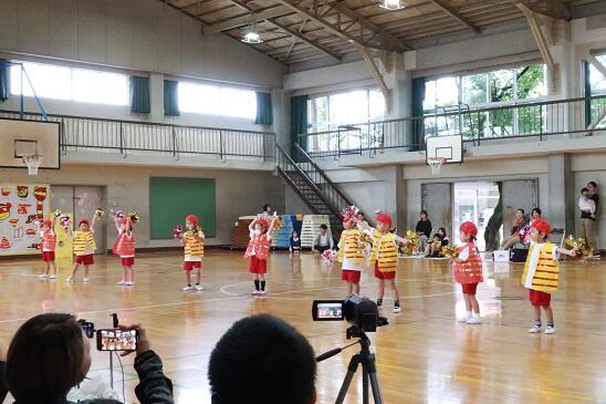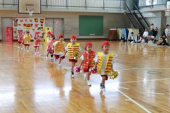 年少つくし組のダンス「たまごはエッグ」です。赤と黄色の縞々模様のかわいい「へなそーる」になって楽しく踊っています。キラキラのポンポンもすてきですね。