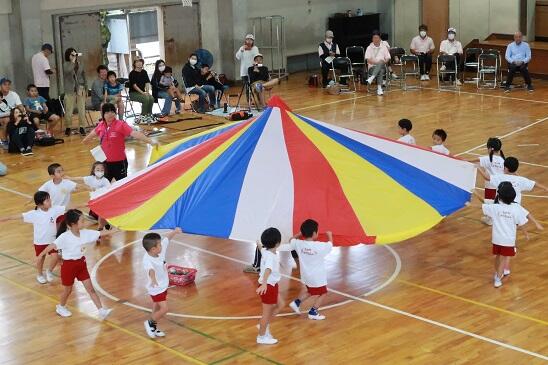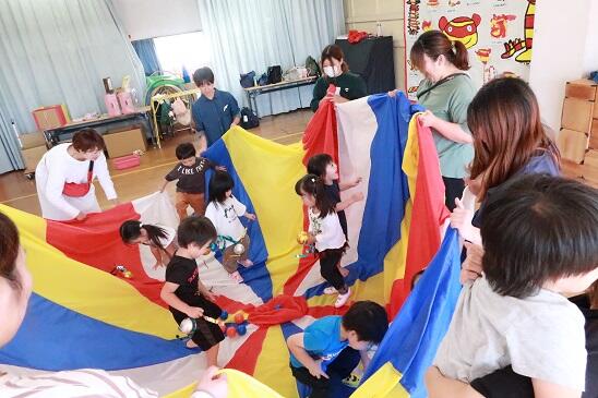 未就園児も遊戯室で、運動会で使ったバルーンで楽しみました。
