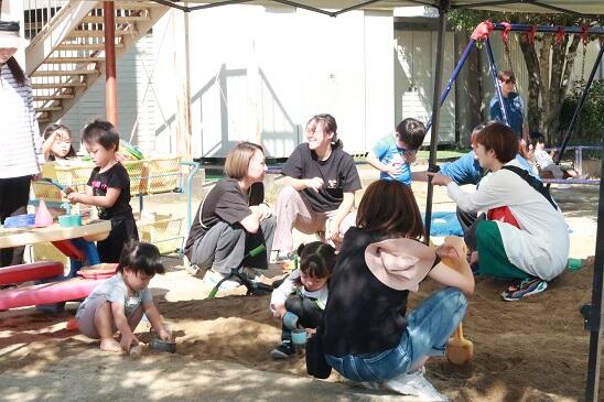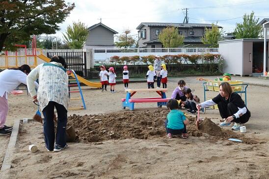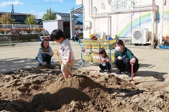 10月3日(火)今年度21回目の未就園児保育を実施しました。今回は9名のお友達が参加してくれました。爽やかな青空の下、園庭の砂場などで好きな遊びです。