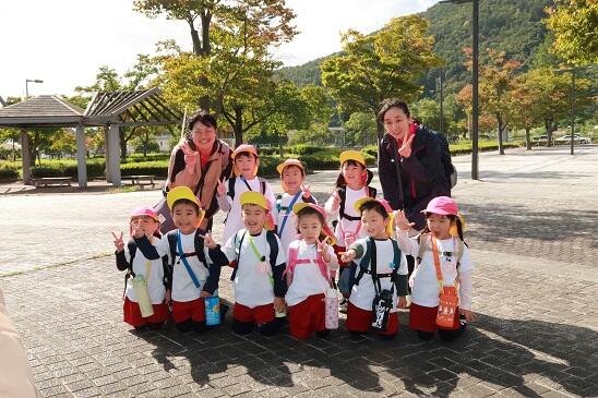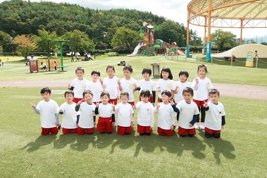 帰りのバスの前に記念撮影です。まだまだみんな元気です。年長たけのこ組です