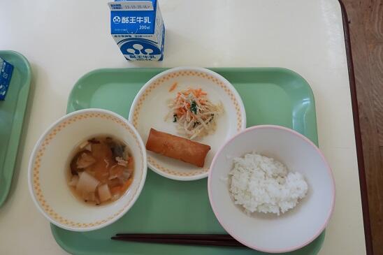 今回のメニューは、春巻き、もやしのナムル、ワンタンスープ、それにご飯と牛乳です。
