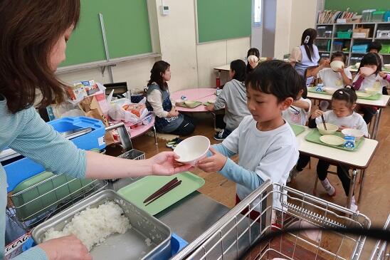 「おかわりお願いしまーす!」たくさん食べれる子どもも増えてきました。