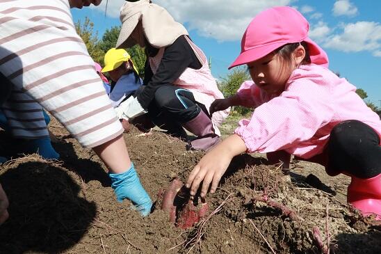 「あっ、さつまいもあったよ!大きいそうだよ!掘れるかな?」