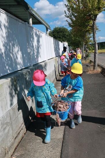 幼稚園まで、みんなで協力して運びます。重いよー!