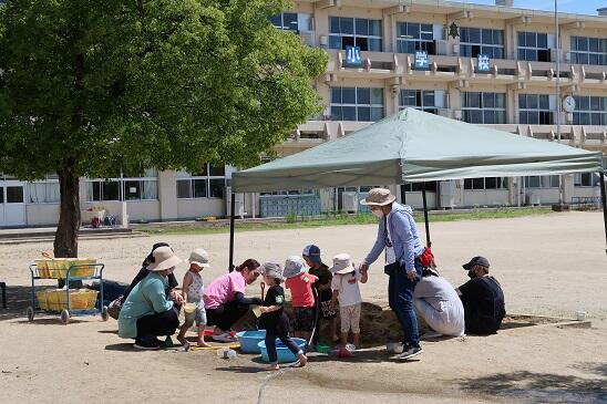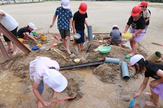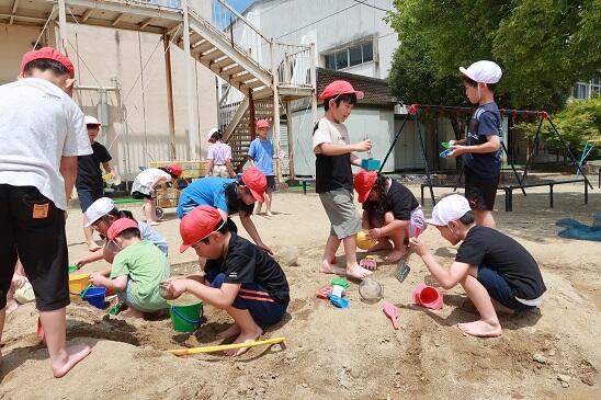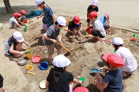 6月21日(水)笹谷小学校の1年生がクラスごとに、笹谷幼稚園の砂場で楽しく砂遊びをしています。コロナ禍で砂場遊びが出来なかった子どもたちもがたくさんいるようです。