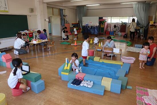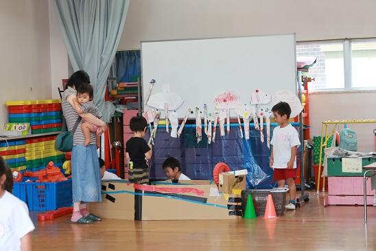 エアコンのきいた室内では、園児と一緒に楽しく遊んでいます。
