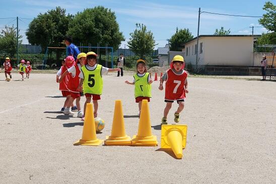 最後は、2チームに分かれてコーンにボールを当てるゲームをしました。