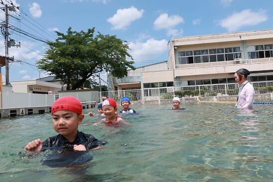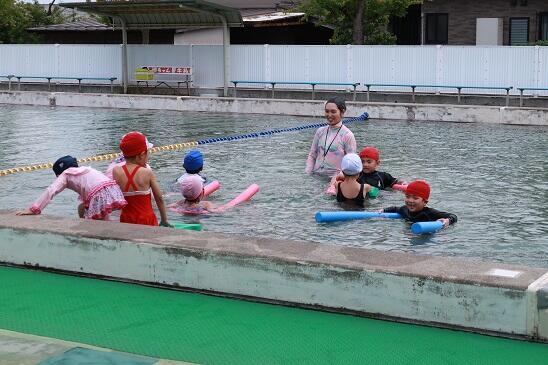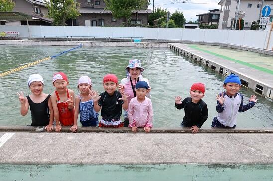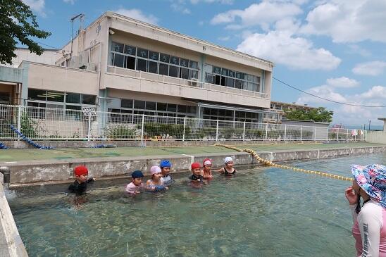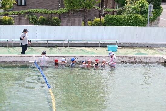 6月26日(月) 年長児は、笹谷小学校のプールに入りました。最初は水に慣れることから始めます。先生についてカルガモの親子のようです。