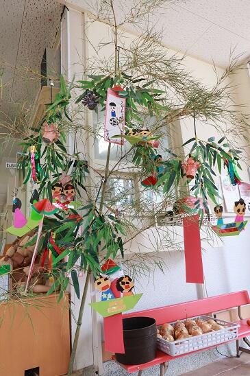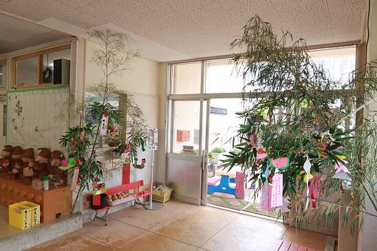 7月3日(月)に、幼稚園玄関に七夕飾りが出現しました。