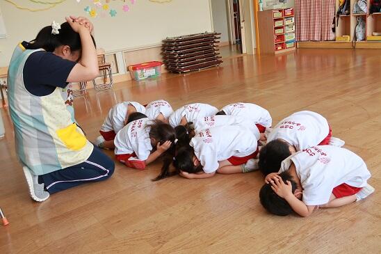 園児たちは、地震発生の放送をよく聞いて、身を守る行動をしっかり行いました。