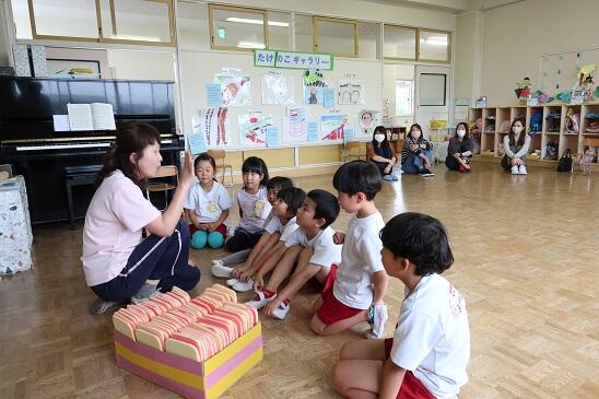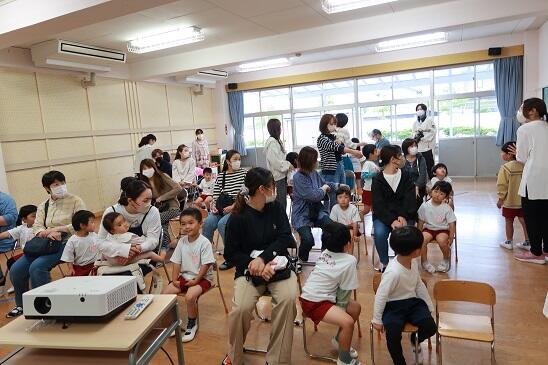 遊戯室で、愛果先生のパンツのお話の読み聞かせを聞きました。
