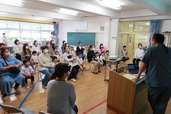 続いて末永先生から、本園で実施しているフッ化物洗口や虫歯にできかた、歯磨きの仕方などのお話をしていただきました。