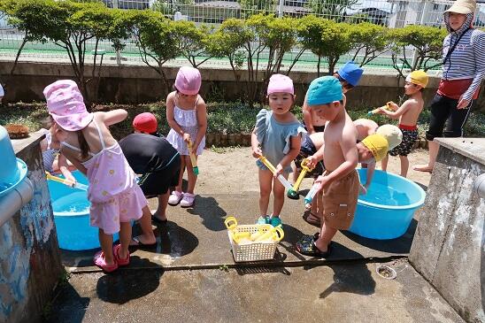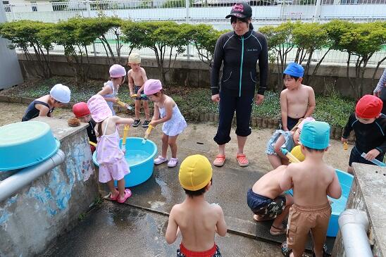 6月5日(月)今年初めての水遊びをしました。プールに入る前に、水着の着替えと水に慣れる練習です。
