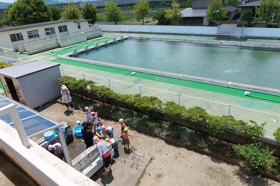 園庭前の笹谷小学校のプールも清掃が終わり、きれいな水でいっぱいになっています。