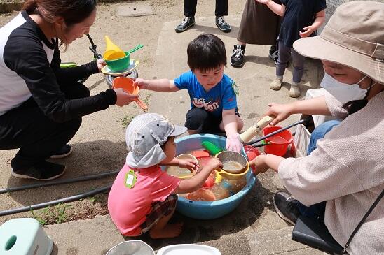 砂場で遊んでいたお友達は道具を洗って、後片付してくれました。