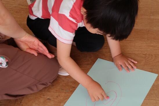 続いて遊戯室に移動して、「走って走って」の曲に合わせてクレパスでお絵かきをしました。