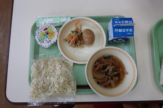 今回のメニューは、醤油ラーメン、福島産ニラ入りもやしサラダ、煮玉子、ふくしまのももゼリーと牛乳です。