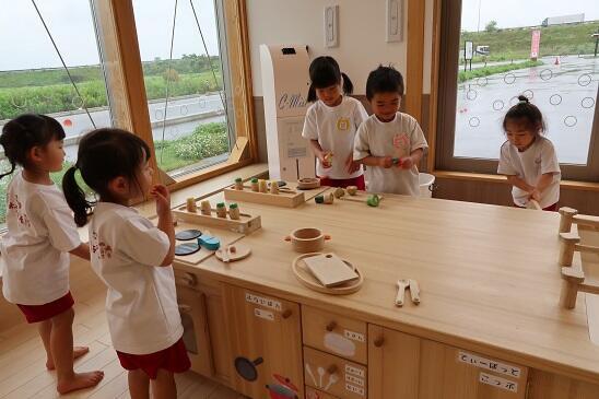 雨が降っていたので、はじめは預かり保育の部屋(すみれ組)でみんなで仲良く遊びました。