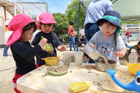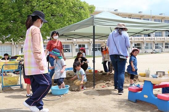 はじめは園庭の砂場で遊びました。暑いので熱中症予防にテントも出しました。