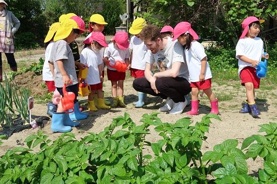 朝の涼しい内に、かがやきファーム(園畑)で、オスカー先生と過ごしました。