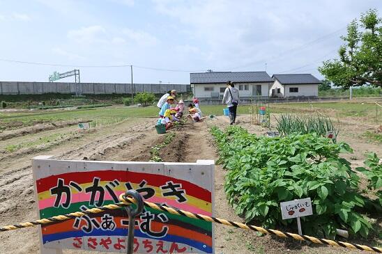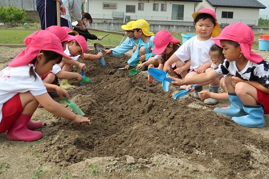 5月22日(月)かがやきファみんなでみんなでサツマイモの苗を植えました。最初に土を柔らかく耕しました。