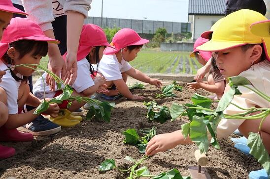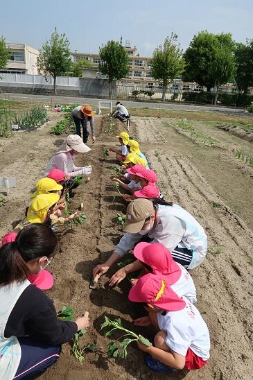 みんな並んで、サツマイモの苗の向きをそろえて優しく植えました。